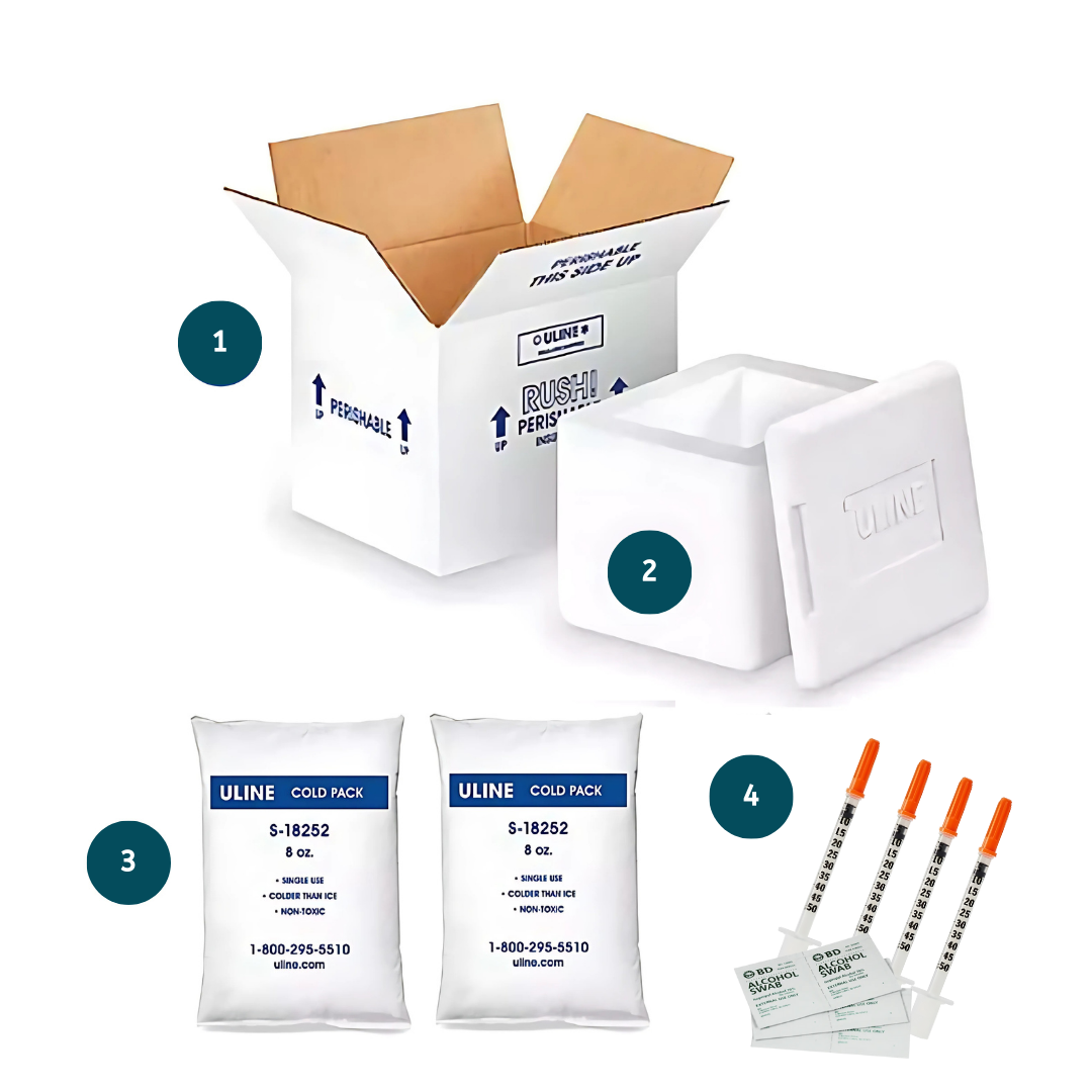 The medication is wrapped in two ULINE Cold Packs. The medication and Cold Packs are inside the foam container. Supplies (needles, syringes and alcohol swabs) are located in the Uline box.